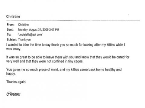 Canoga Park, Los Angeles, CA Ive been using Uncle Jeff's Pet Sitting now twice a month for the past year. He takes care of my 4 cats and my bichon. Uncle Jeff's Pet Sitting sends me regular photos which is so important to me. He gives me regular updates on how they are all doing. Nothing is ever too much trouble for Uncle Jeff's Pet Sitting . Uncle Jeff's Pet Sitting is very flexible when it comes to ypur pets needs. He is
